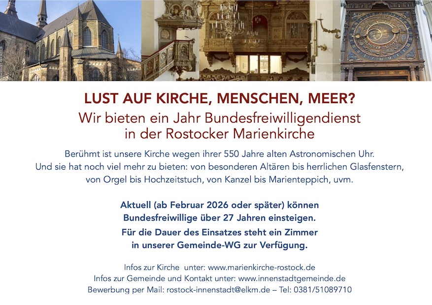 Am 1. Januar 2026 fusionierte die Innenstadtgemeinde mit Gehlsdorf und Dierkow zur Jakobus-Kirchengemeinde Rostock. Die Inhalte dieser Website werden fortlaufend den neuen Verhältnissen angepasst. Momentan ist der Gemeindebrief (Papier und online>) ein gutes Mittel, um zu erfahren, an welchen Orten was stattfindet.