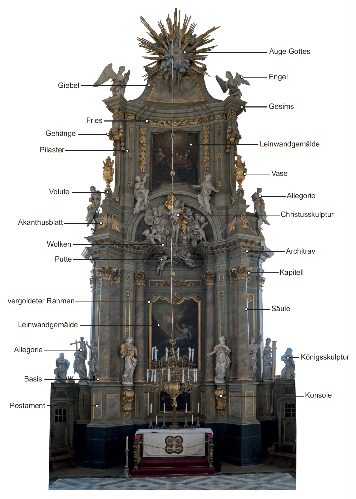 Was ist was auf unserem Altar? Restaurator Bastian Hacker hat die einzelnen Elemente mit den Fachbegriffen der Kunstgeschichte bezeichnet – klicken Sie auf das Bild für eine große Darstellung!