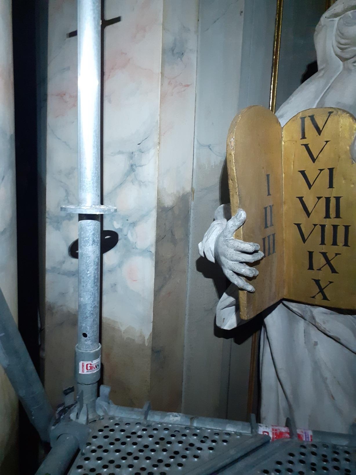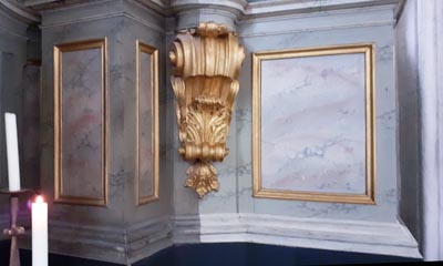 Unser großer Altar ist im Sommer 2021 also genau 300 Jahre alt geworden. Das haben wir zum Anlass genommen, ihn an einer kleinen Stelle probehalber zu reinigen. So eine Reinigung kostet eine Menge Geld. Dafür kann man auch keinen Lappen und Staubsauger verwenden, sondern da müssen Fachleute ran, Restauratoren.