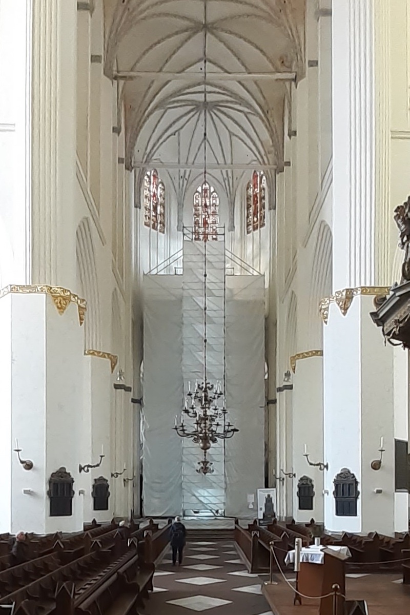 Und so sieht es zur Zeit in der Kirche aus, wenn die Scheinwerfer der Restauratoren ein besonderes Licht in den Chorraum von St. Marien zaubern…: