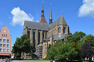 St. Marien wurde erstmals im Jahr 1232 erwähnt. Die heutige Kirche vereinigt Bausubstanz ungefähr aus der Zeit von 1260 bis 1450. Ihre Innensanierung ist nach über zwanzig Jahren fast abgeschlossen. Als Ratskirche und Gründungsort der Universität (1419) hat sie in Rostock hervorgehobene Bedeutung. Sie enthält wertvolle Kunstgüter, am bekanntesten davon ist die Astronomische Uhr>.
