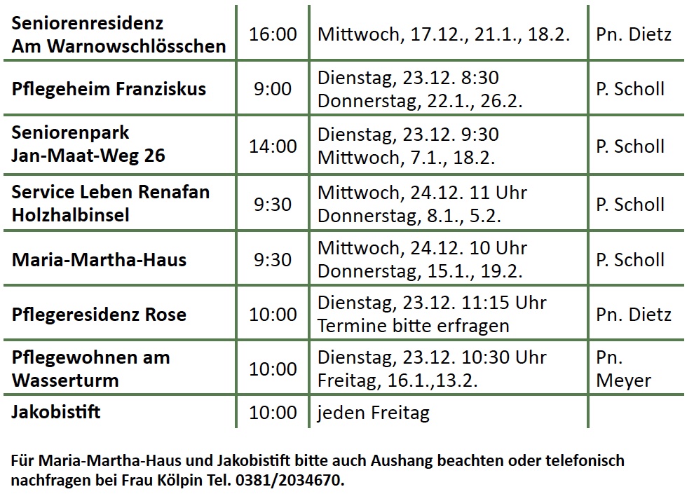 jeweils Montag/Dienstag im Pfarrhaus Gehlsdorf, Uferstraße 4. Informationen bei Regina Blischke, Tel. 0381-699230