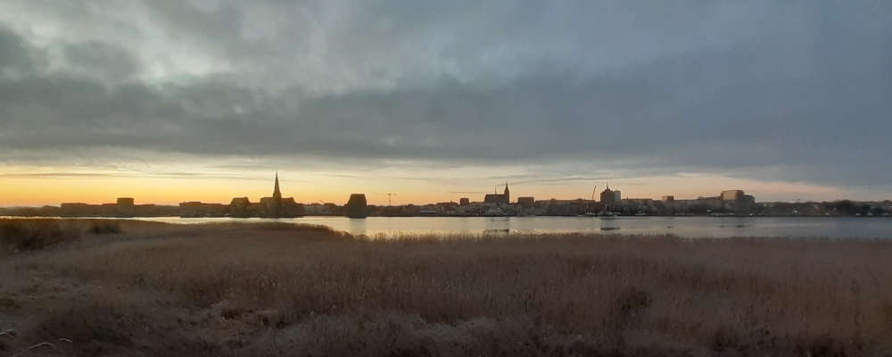 Blick vom Warnow-Nordufer am Stadthafen – ungefähr an der Grenze der Ortsteile Dierkow (links) und Gehlsdorf (rechts) – auf die Innenstadt.